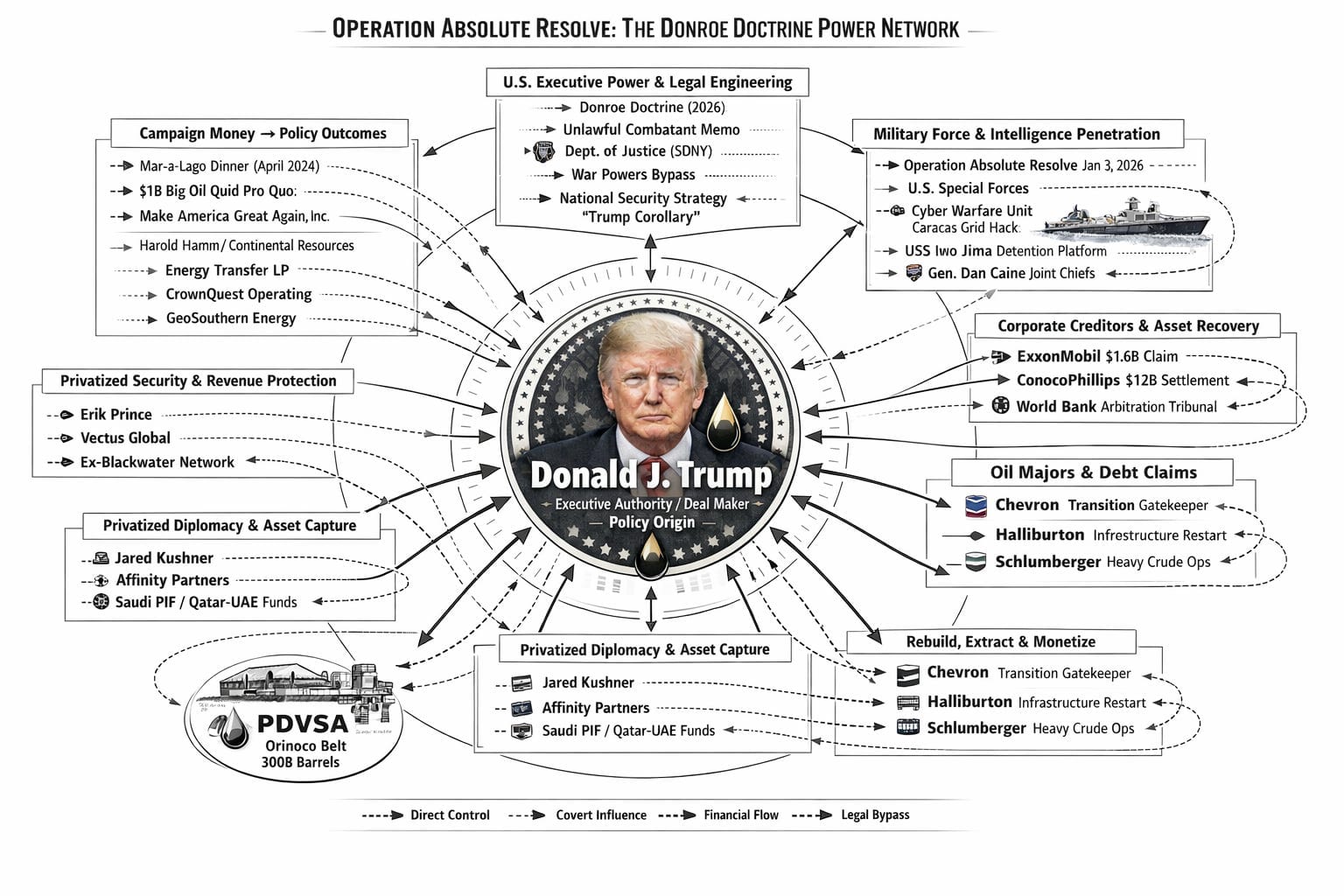 이는 베네수엘라 국영 석유회사(PDVSA)의 경영권을 사실상 미국이 장악하고, 셰브론과 엑손모빌 등 미 에너지 대기업을 추출 체계에 통합하는 방식이다. 미국은 이를 통해 세계 최대 석유 매장지인 오리노코 벨트를 자국의 공급망 안보 하에 두게 되었다. 이는 중국의 에너지 안보를 직접 위협하고 러시아의 석유 수입을 압박하는 고도의 지정학적 포석이다.